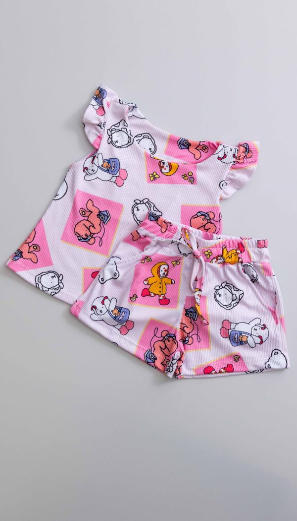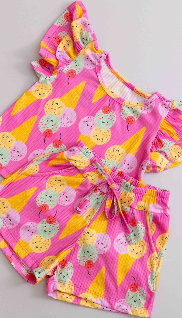 Conjunto Canelado Infantil De Blusa Com Manga Babado E Shorts Feminino Estampa De Sorvetes ColoridosR$ 69,90R$ 66,41 à vista no PIXaté 3x de R$ 23,30 s/ juros