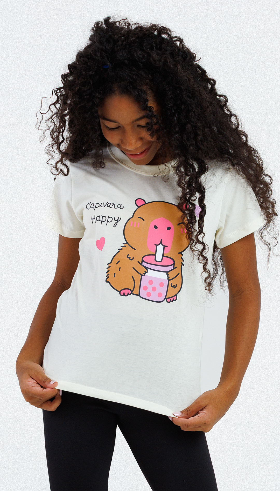 Camiseta de malha em 100% algodão, super confortável com estampa da capivara