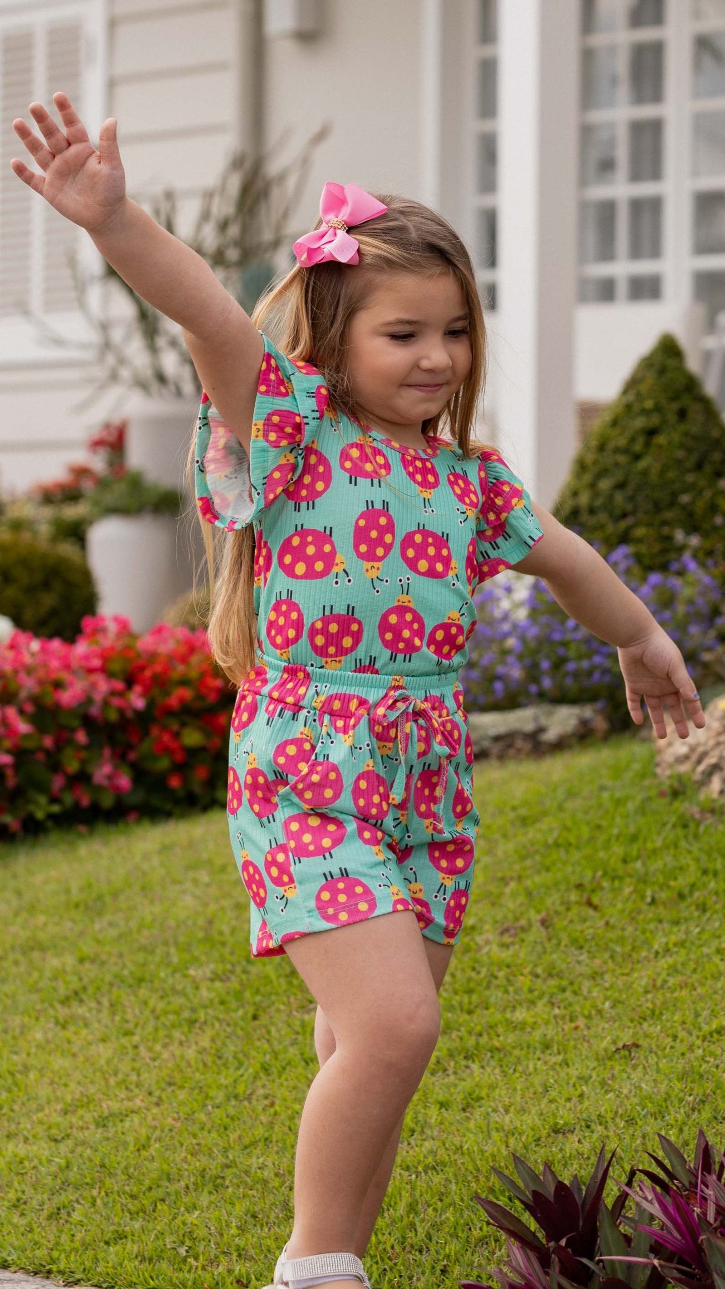 Conjunto Canelado Infantil De Blusa Com Manga Babado E Shorts Feminino Estampa De Joaninhas