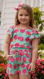 Conjunto Infantil de Blusa com manga de babado , e shorts com elástico na cintura, bolsos na frente e detalhe da cordinha.