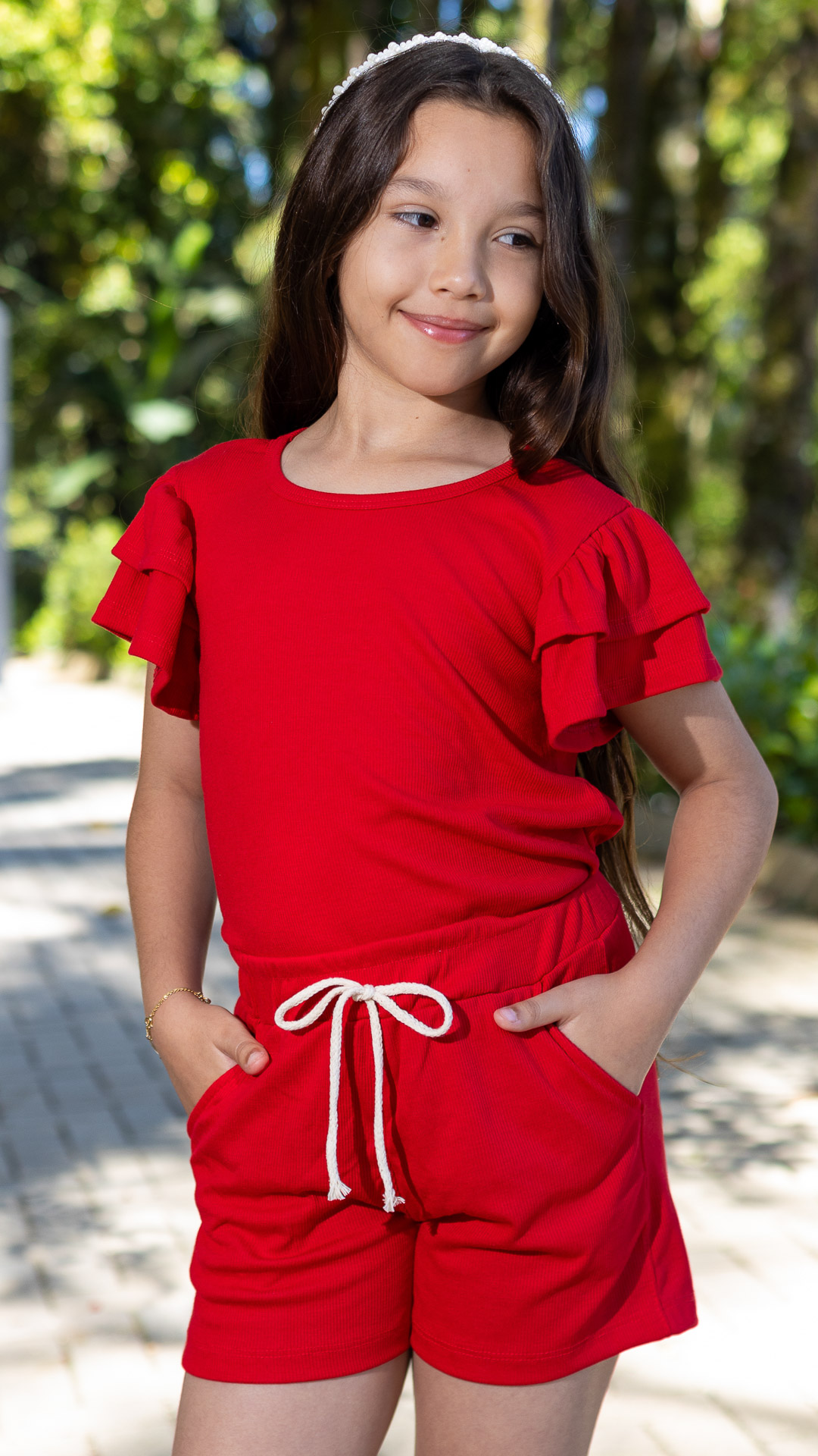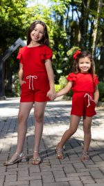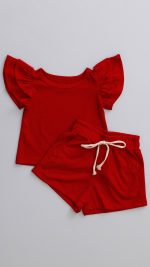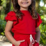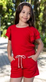 Conjunto Canelado Infantil De Blusa Com Manga Babado E Shorts Feminino Vermelho