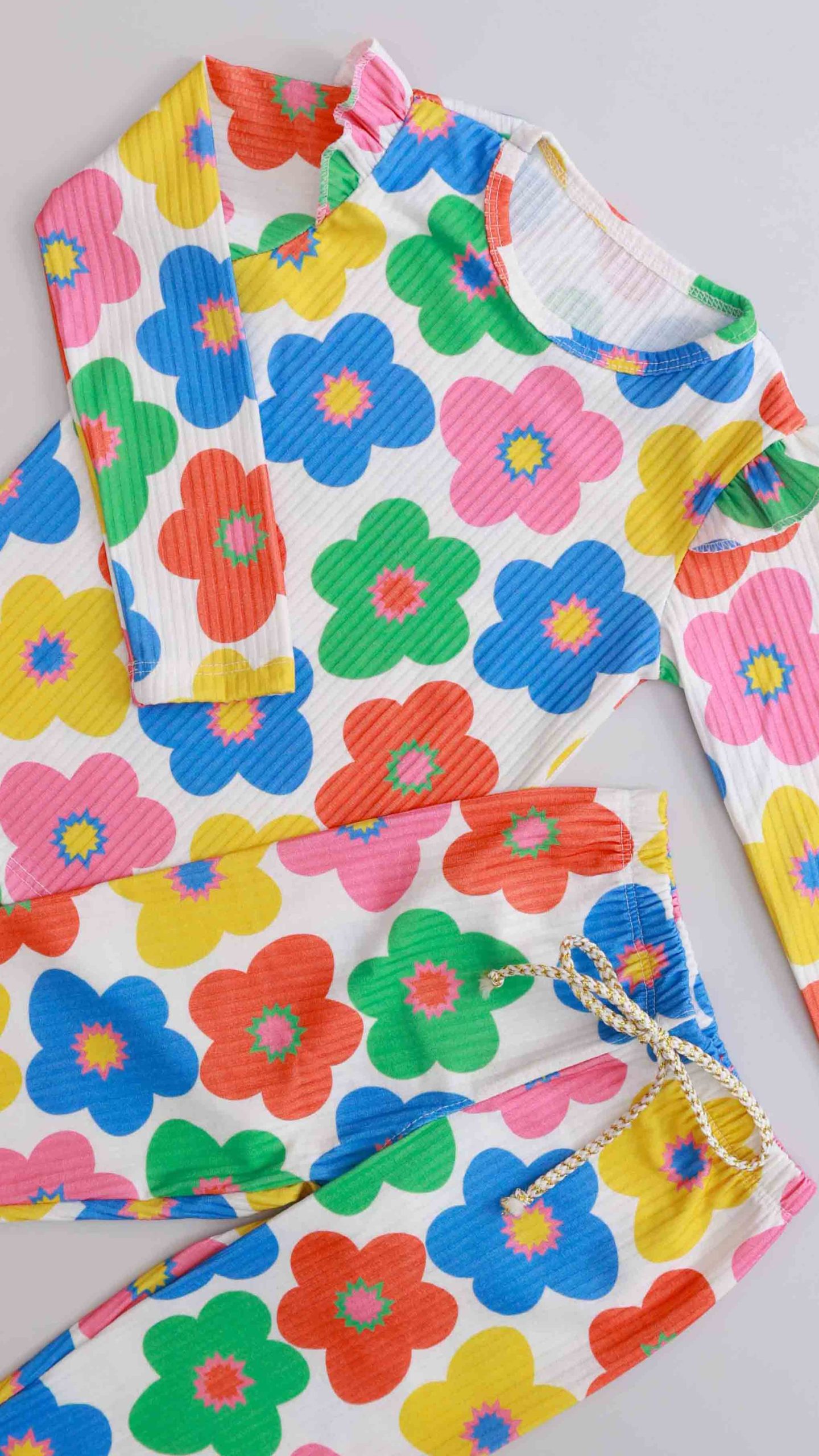 Conjunto Infantil de Malha Canelada Estampada, malha com elastano super confortável.