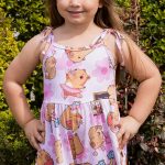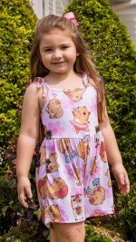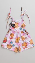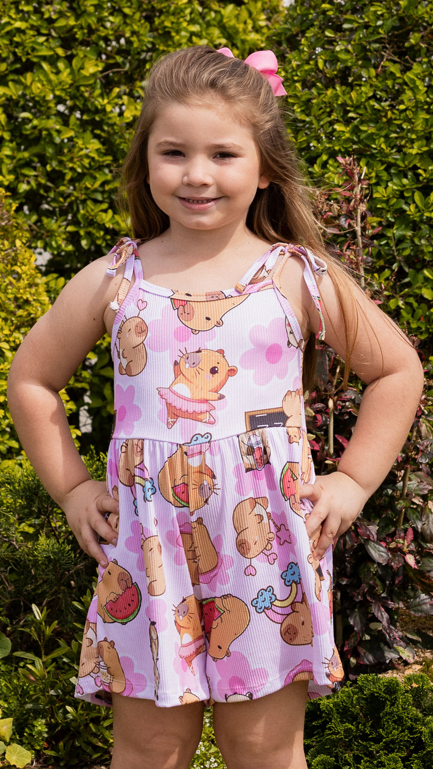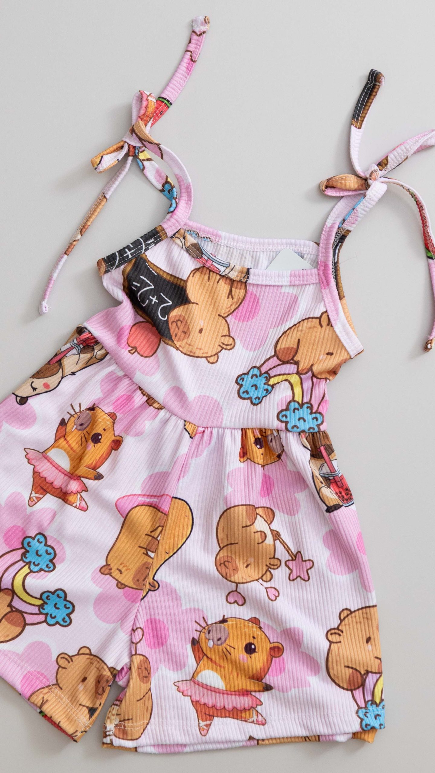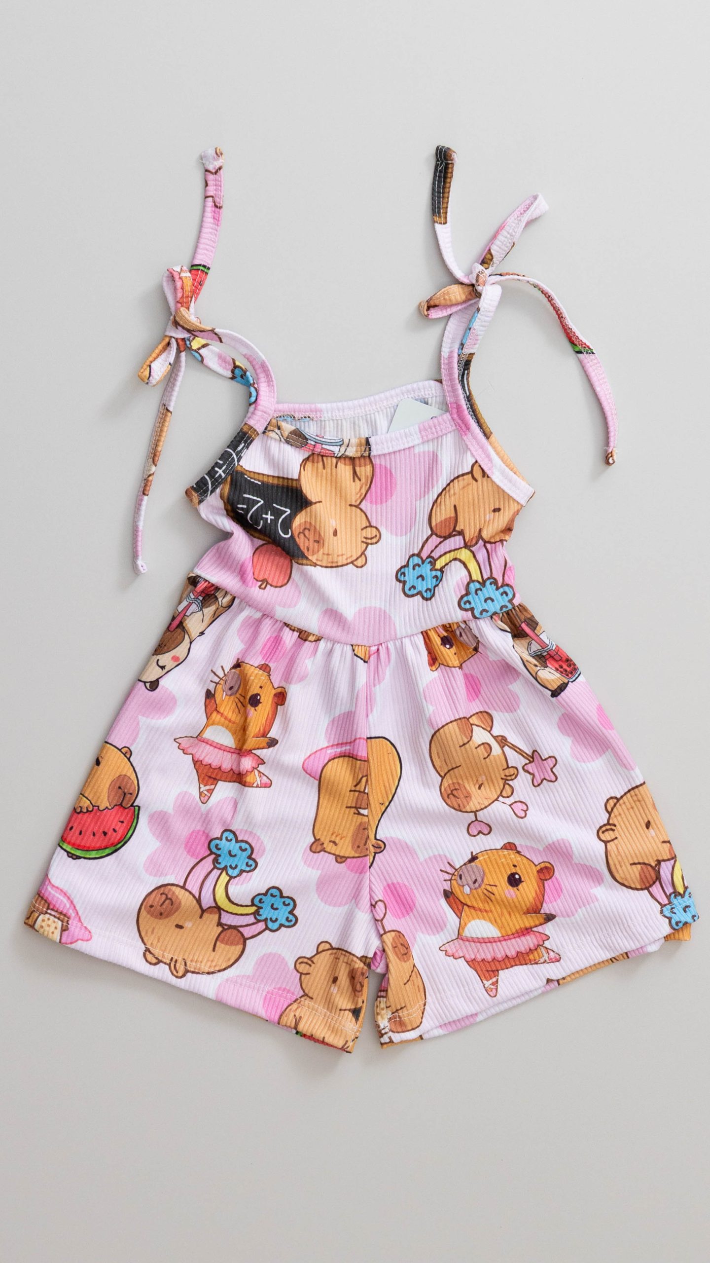 Macaquinho Canelado Infantil Com Alçinha de Amarração Feminino Com Estampa Capivara Rosa
