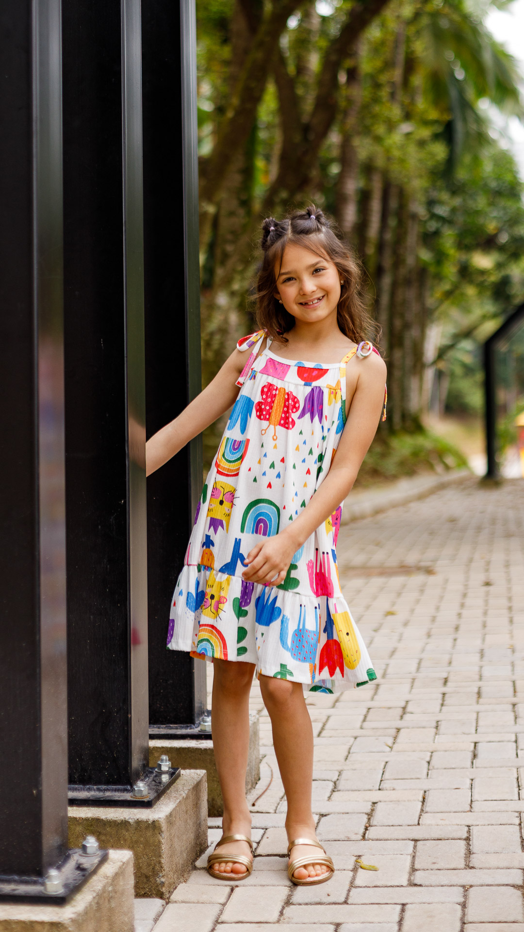 Vestido Canelado Infantil Feminino Com Alçinha De Amarração E Babado Na Barra Estampa Encantada