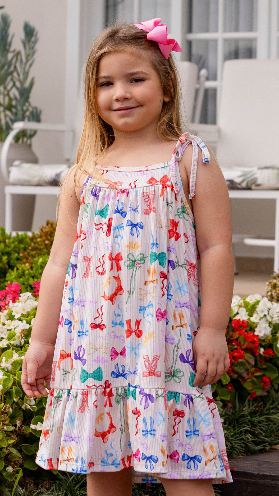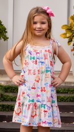 Vestido Canelado Infantil Feminino Com Alçinha De Amarração E Babado Na Barra Estampa Laçinhos Coloridos